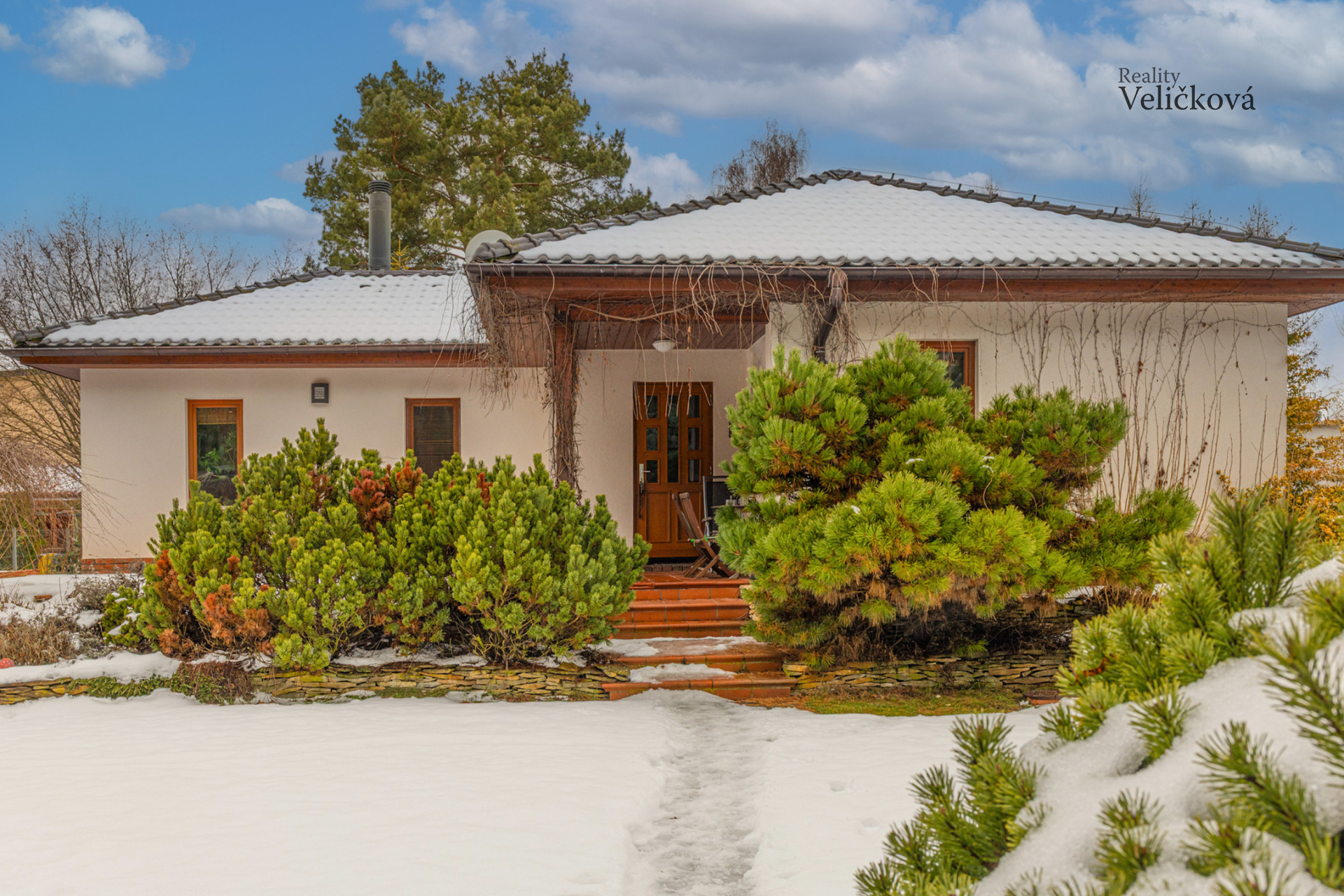 Okna jsou kvalitní dřevěná s izolačním trojsklem, interiérové dveře kvalitní dřevěné obložkové. Valbová střecha je pokryta pálenou taškou KM Beta. Na zahradě je instalován systém zavlažování napojený na studnu.