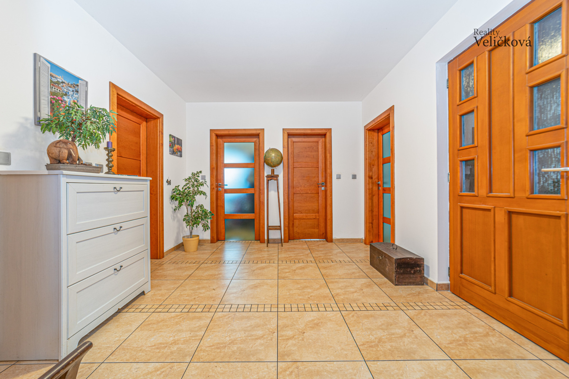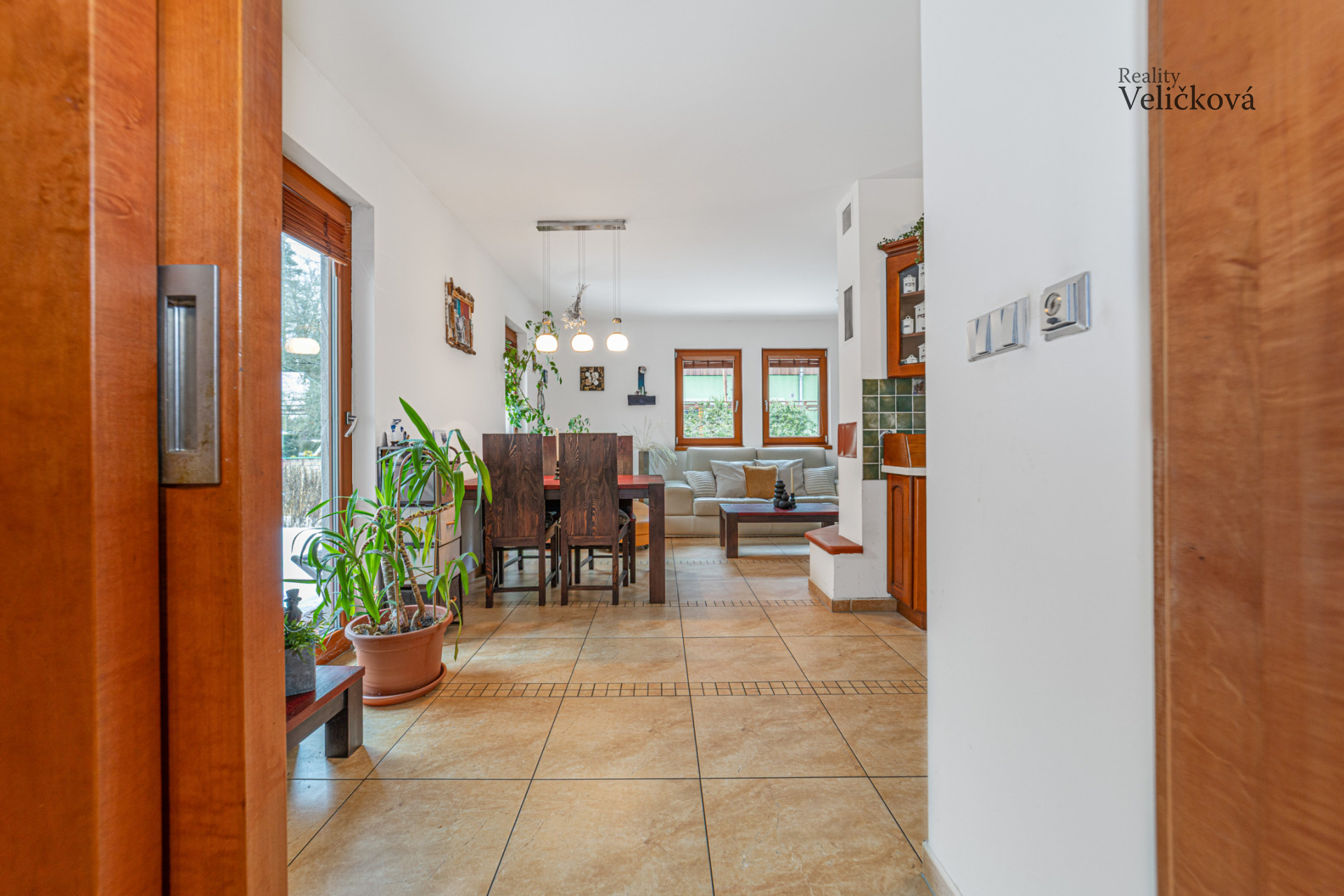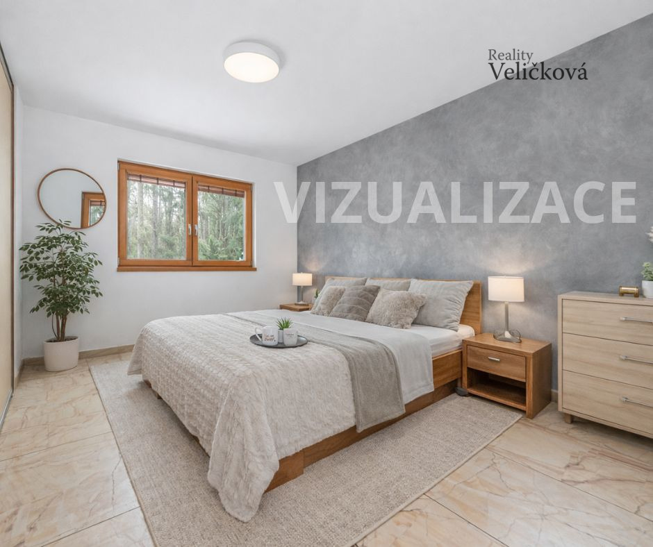 Dispozice: vstupní chodba, 2 ložnice, koupelna s vanou, sprchovým koutem, umyvadlem a WC, komora, chodba, samostatné WC, kuchyň (s vestavěnými spotřebiči - lednice a mrazák Bosch, trouba Ariston, sklokeramická deska, digestoř, granitový dřez, myčka) s obývacím pokojem a krbem (zn. Jotul). Obývací pokoj nabízí výhledy na jižní a západní stranu.