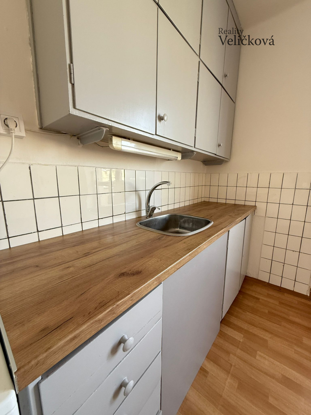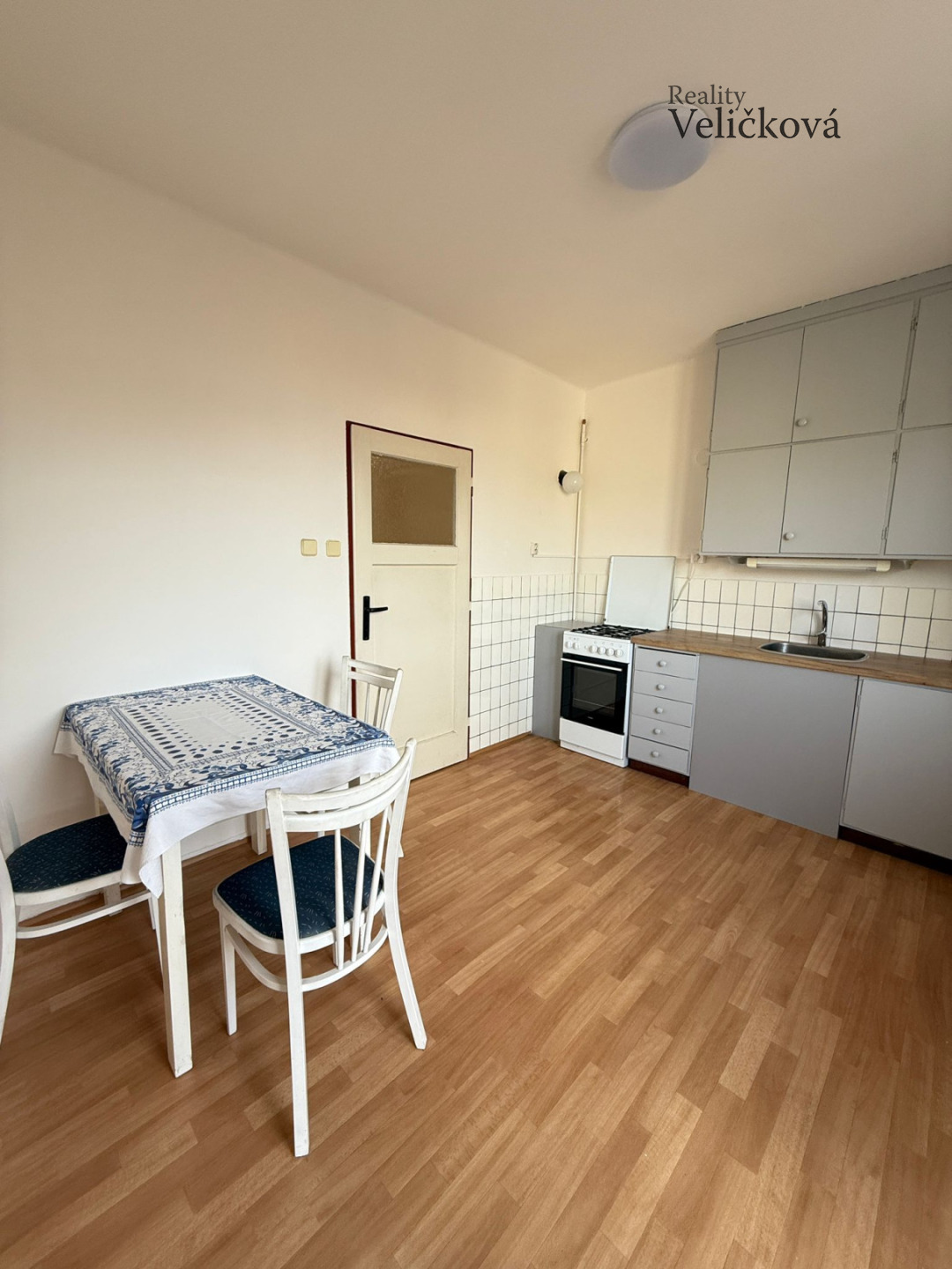 Kuchyň je orientována na západ a je vybavena kuchyňskou linkou s nerezovým dřezem, plynovým sporákem, elektrickou troubou, jídelním stolem se židlemi a praktickou komorou pro uskladnění potravin nebo kuchyňského vybavení. Z kuchyně je vstup na balkon, který nabízí výhled do vnitrobloku.