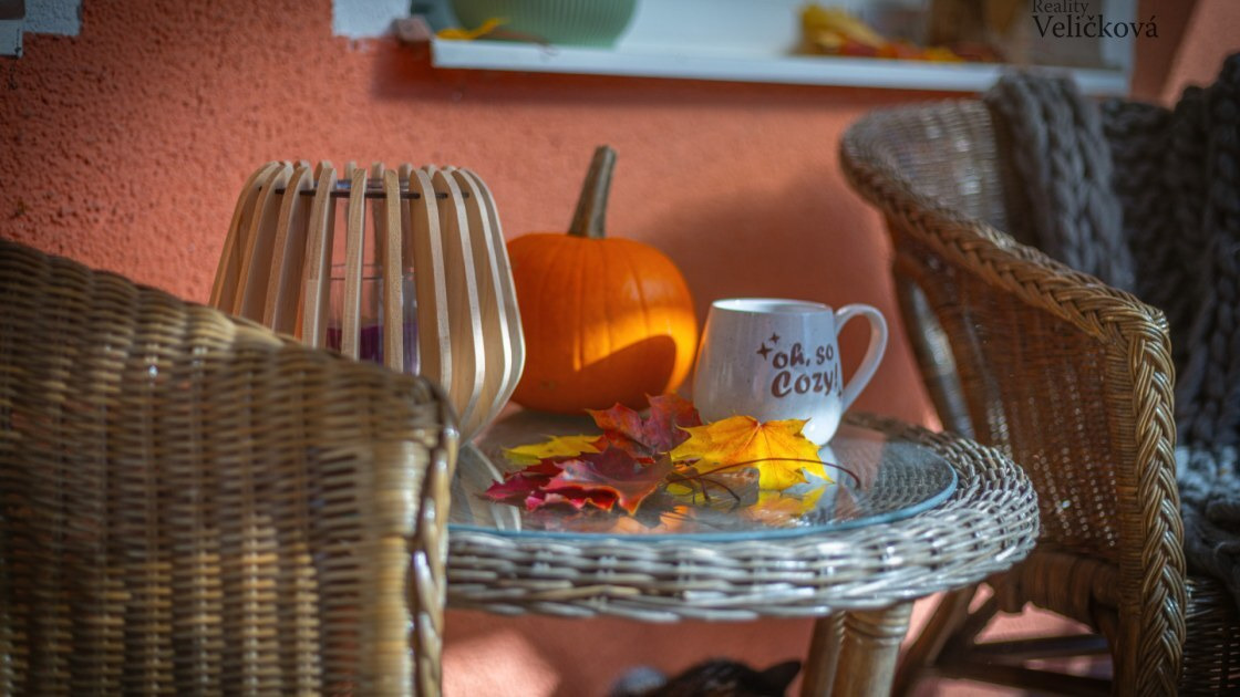 Jedním z klíčových míst celé proměny byla terasa. Z prostoru, který původně působil prázdně a nevýrazně, jsme chtěli vytvořit útulný kout, kam se budete chtít posadit s knihou nebo šálkem horkého čaje. Na terasu jsme proto umístili ratanová křesílka, přidali měkké deky a hrnky s horkým nápojem. Na okně nesměla chybět váza s pugétem podzimních květin. Celý prostor jsme doladili nasbíraným podzimním listím a živými dýněmi.