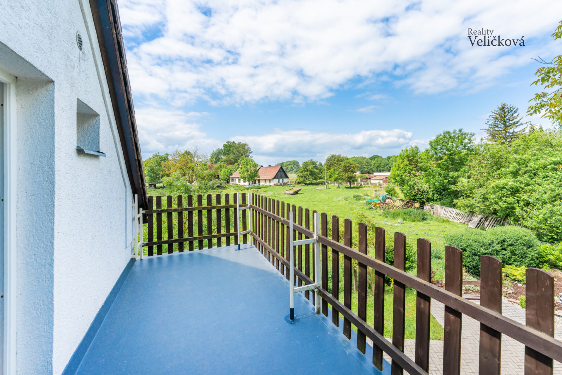 V patře domu se nachází chodba s velkou vestavěnou skříní a vstupem na balkon, prostorný dětský pokoj, kde si děti dostatečně vyhrají díky lezecké stěně, která je součástí prodeje, velký obytný pokoj, který může sloužit jako druhý dětský pokoj nebo pokoj pro hosty, menší koupelna s vanou a WC.