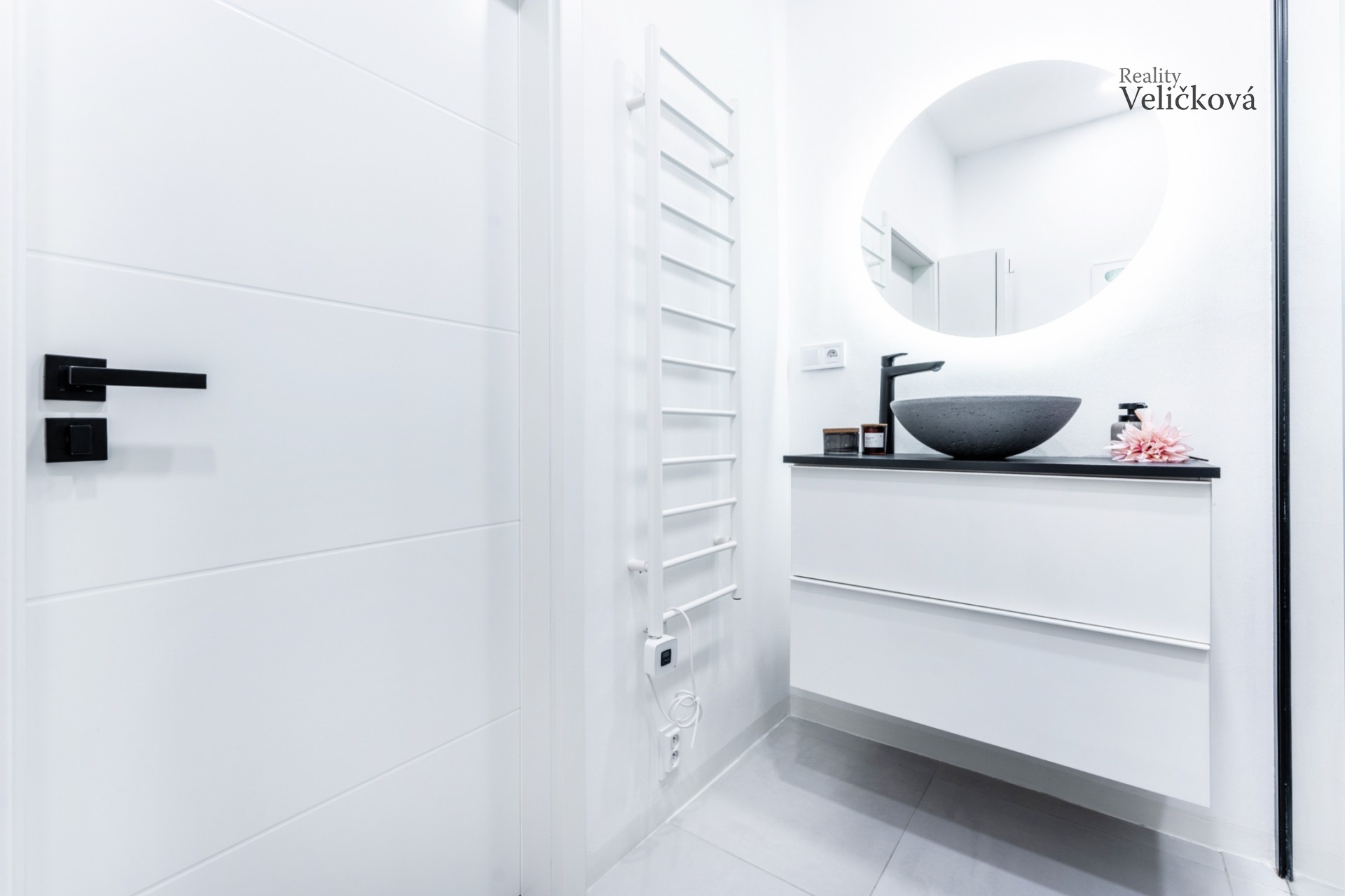 V celém bytě jsou kvalitní dřevěné podlahy a obložkové dveře v bílém dekoru, nová plastová okna se žaluziemi. Z chodby do kuchyně jsou instalovány masivní designové dveře s kovovými prvky. V koupelně a na chodbě je moderní velkoformátová dlažba značky Villeroy Boch. Majitelé navíc zanechají v rámci vybavení bytu pračku se sušičkou značky Elektrolux.