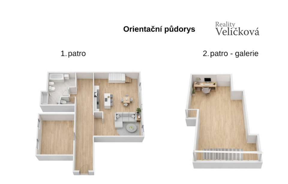 První patro bytu dispozičně zahrnuje prostornou chodbu, koupelnu s oddělenou toaletou a dvě obytné velkometrážní místnosti. Dispozice přirozeně umožňuje využití jedné z nich jako ložnice, druhé pak jako obývacího pokoje s kuchyňským koutem. Prostor umožňuje rozdělení místností na více pokojů v případě potřeby. Otevřená galerie v druhém patře rozšiřuje obytnou plochu a poskytuje variabilní využití například jako ložnice, pracovna či relaxační zóna.