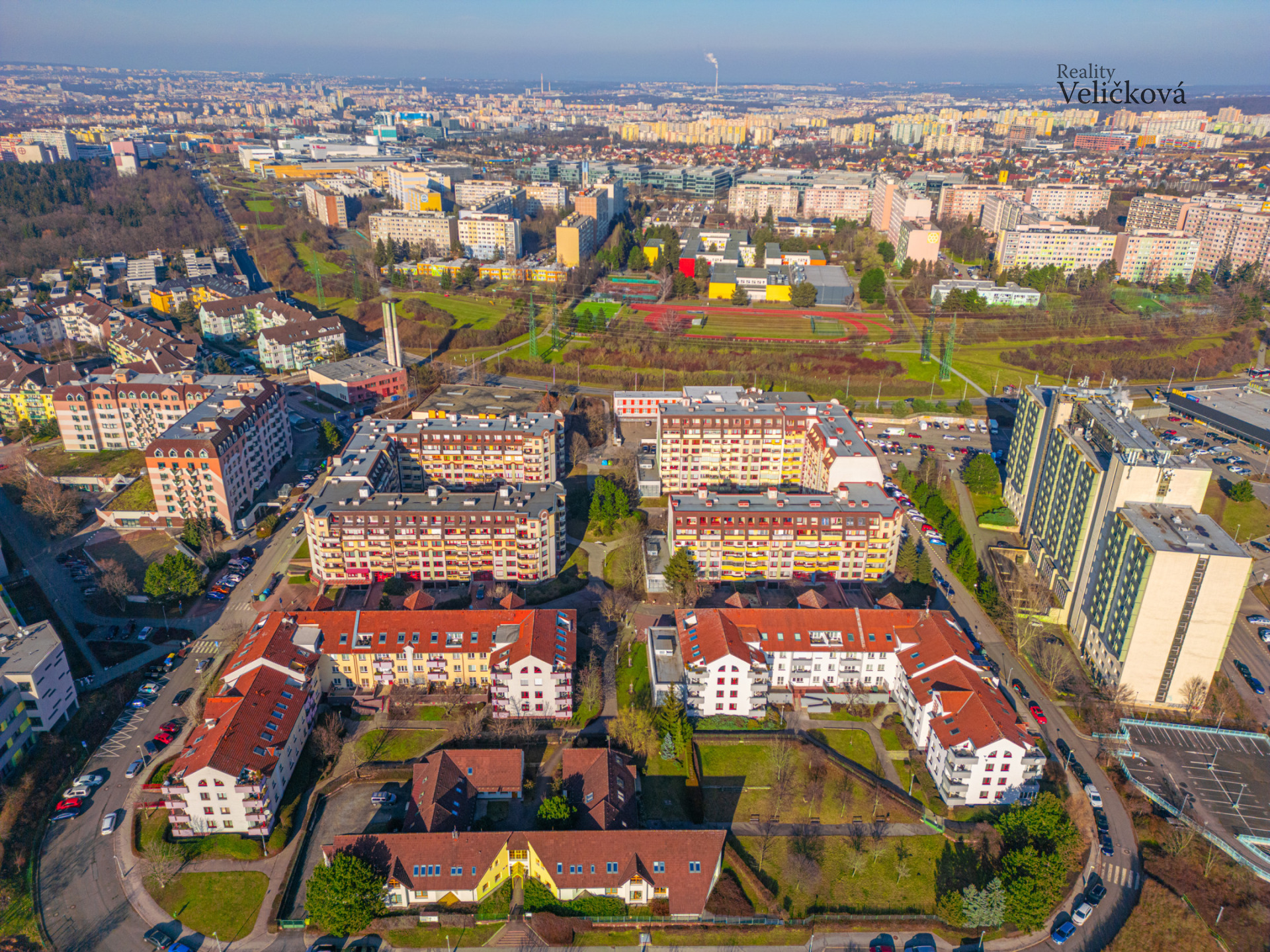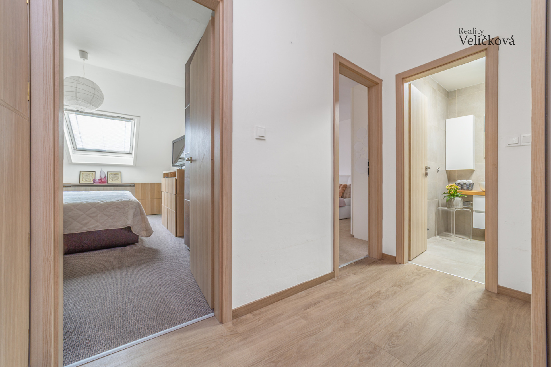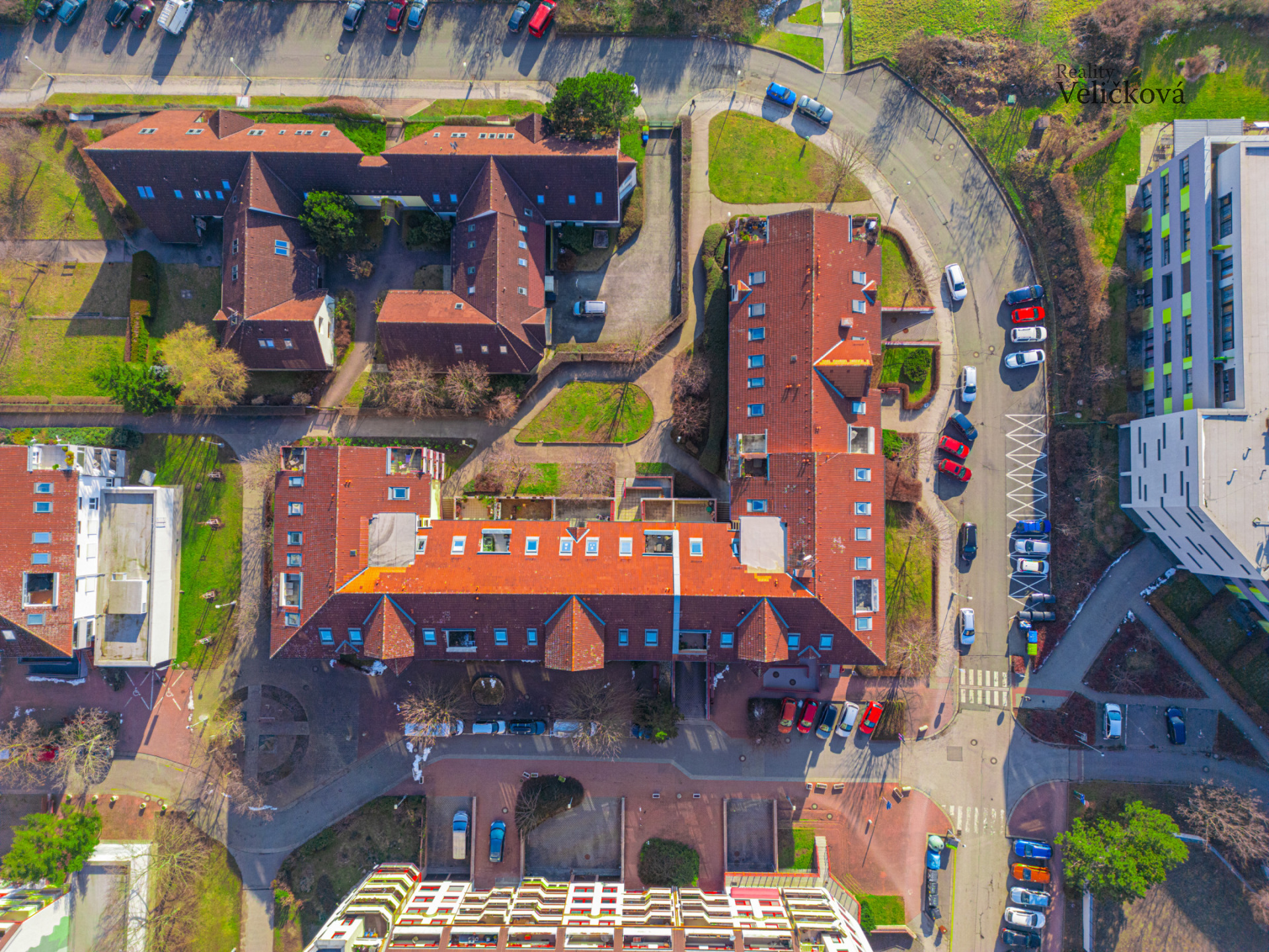 Dům byl zkolaudován v r. 1996, byt i budova však prošly v posledních letech dalšími rekonstrukcemi, která zahrnovaly např. modernizaci koupelny a WC (2023), instalaci klimatizace (2025), zasklení lodžie (2024) a další. Díky tomu nabízí velmi příjemné a funkční bydlení bez nutnosti větších investic. Dispozice bytu jsou velmi nadčasové a moderní, s oddělenou denní a klidovou částí. Vstup do bytu je prostorný, předsíň nabízí velkorysých 12,96 m2. Z ní je přímý přístup do kuchyně se spíží a jídelnou (popř. obývacím pokojem). Přímo z kuchyně je vstup na vloženou atriovou terasou (11,89 m2). Tato část bytu je plynule napojena na obývací pokoj s pracovnou (27,51 m2). Z předsíně pokračujeme kolem sam. toalety do klidové části bytu, čítající chodbu, velmi moderní koupelnu se sprchovým koutem a druhou toaletou a dále navazují 2 ložnice o výměrách 14,7 m2 a 16,72 m2, jedna z nich nabízí vlastní lodžii. V suterénu budovy je k dispozici sklepní kóje (3,44 m2), ke které se prochází garážovým prostorem, kde je možné po dohodě s majitelem pronajmout jedno stání.