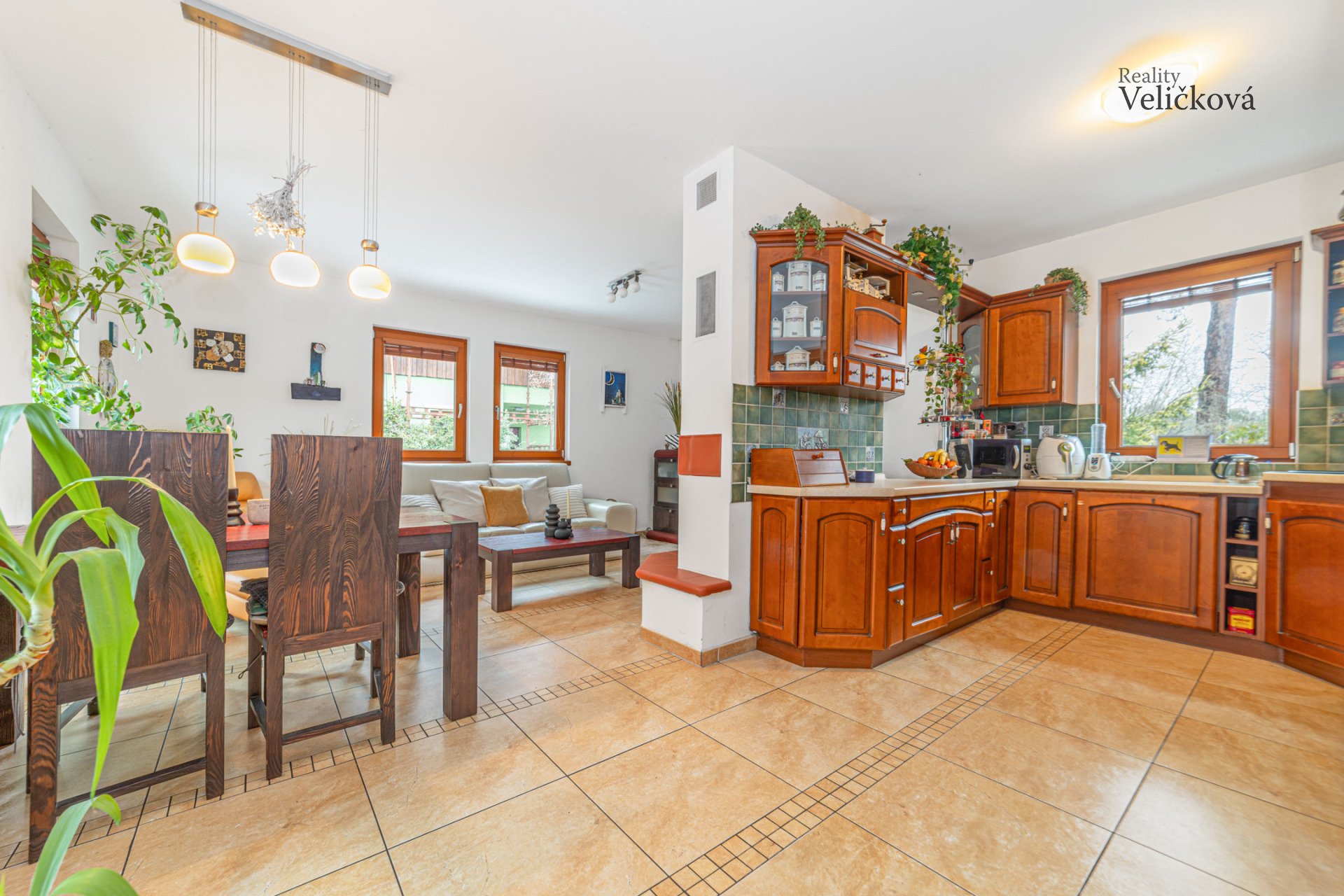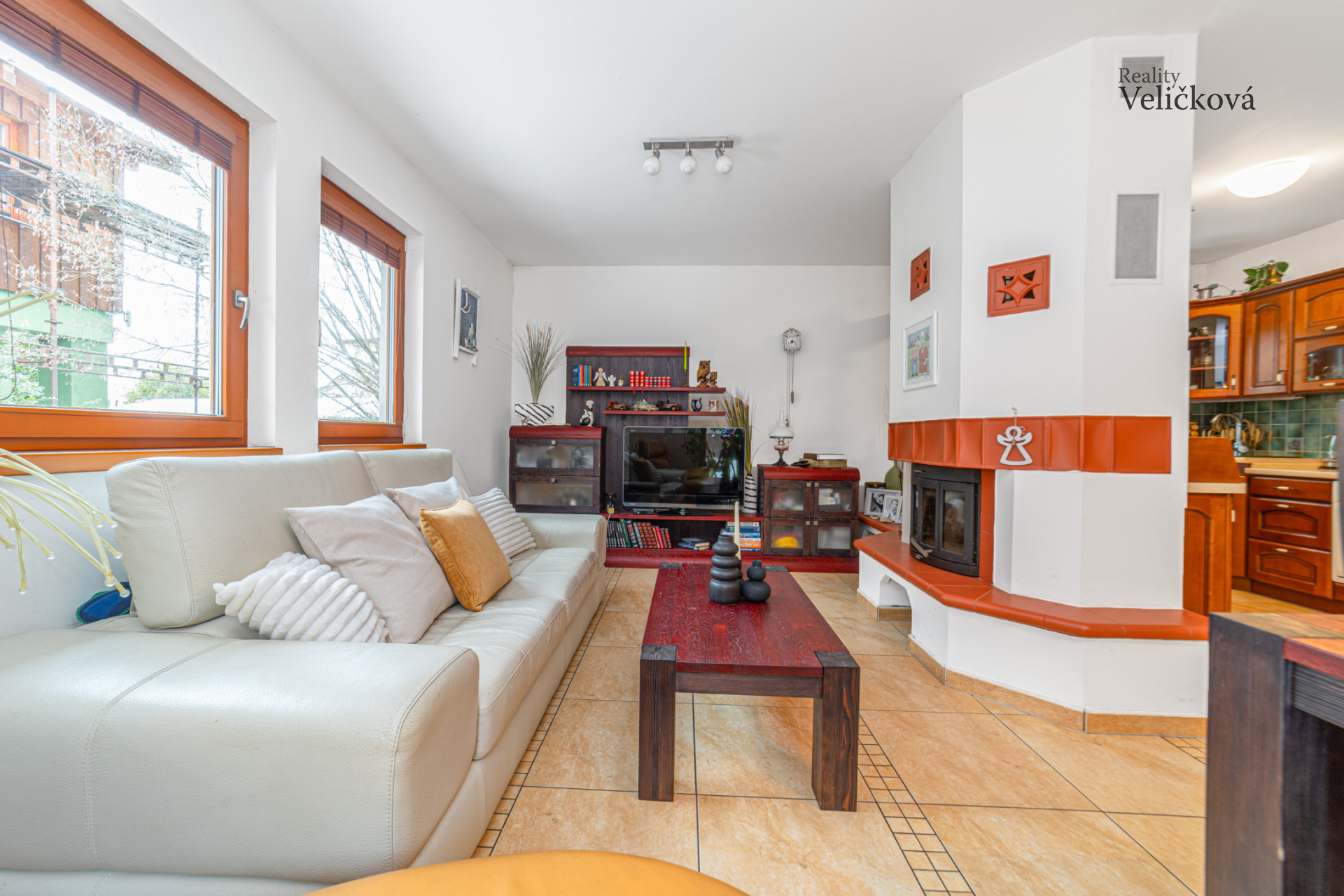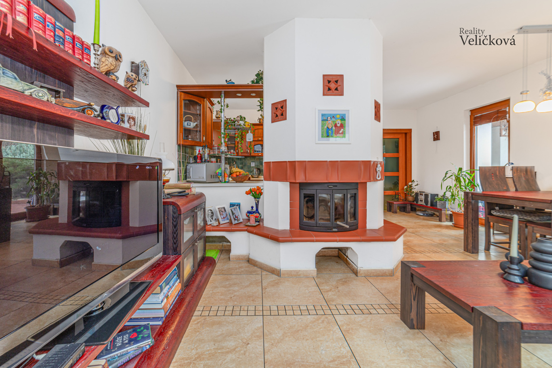 Dispozice: vstupní chodba, 2 ložnice, koupelna s vanou, sprchovým koutem, umyvadlem a WC, komora, chodba, samostatné WC, kuchyň (s vestavěnými spotřebiči - lednice a mrazák Bosch, trouba Ariston, sklokeramická deska, digestoř, granitový dřez, myčka) s obývacím pokojem a krbem (zn. Jotul). Obývací pokoj nabízí výhledy na jižní a západní stranu.
