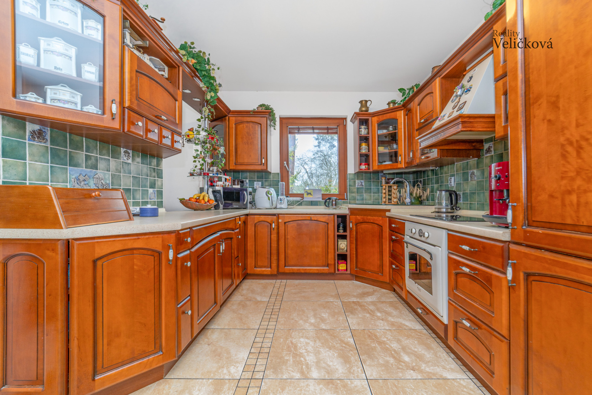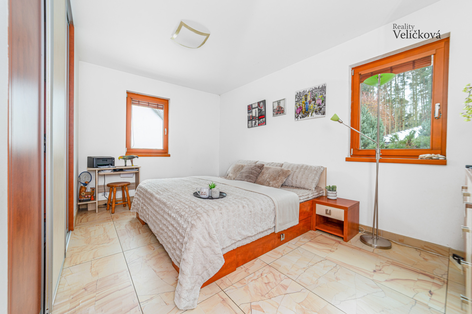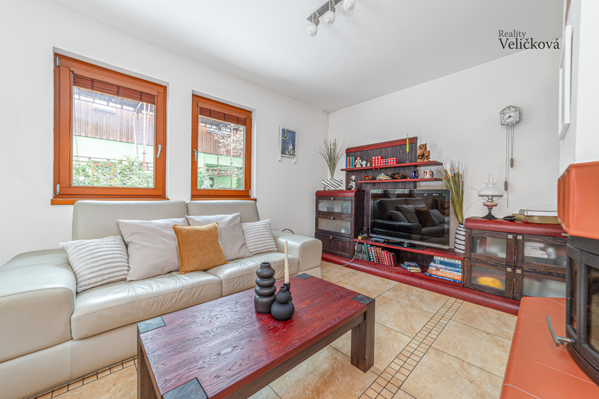 Dispozice: vstupní chodba, 2 ložnice, koupelna s vanou, sprchovým koutem, umyvadlem a WC, komora, chodba, samostatné WC, kuchyň (s vestavěnými spotřebiči - lednice a mrazák Bosch, trouba Ariston, sklokeramická deska, digestoř, granitový dřez, myčka) s obývacím pokojem a krbem (zn. Jotul). Obývací pokoj nabízí výhledy na jižní a západní stranu.