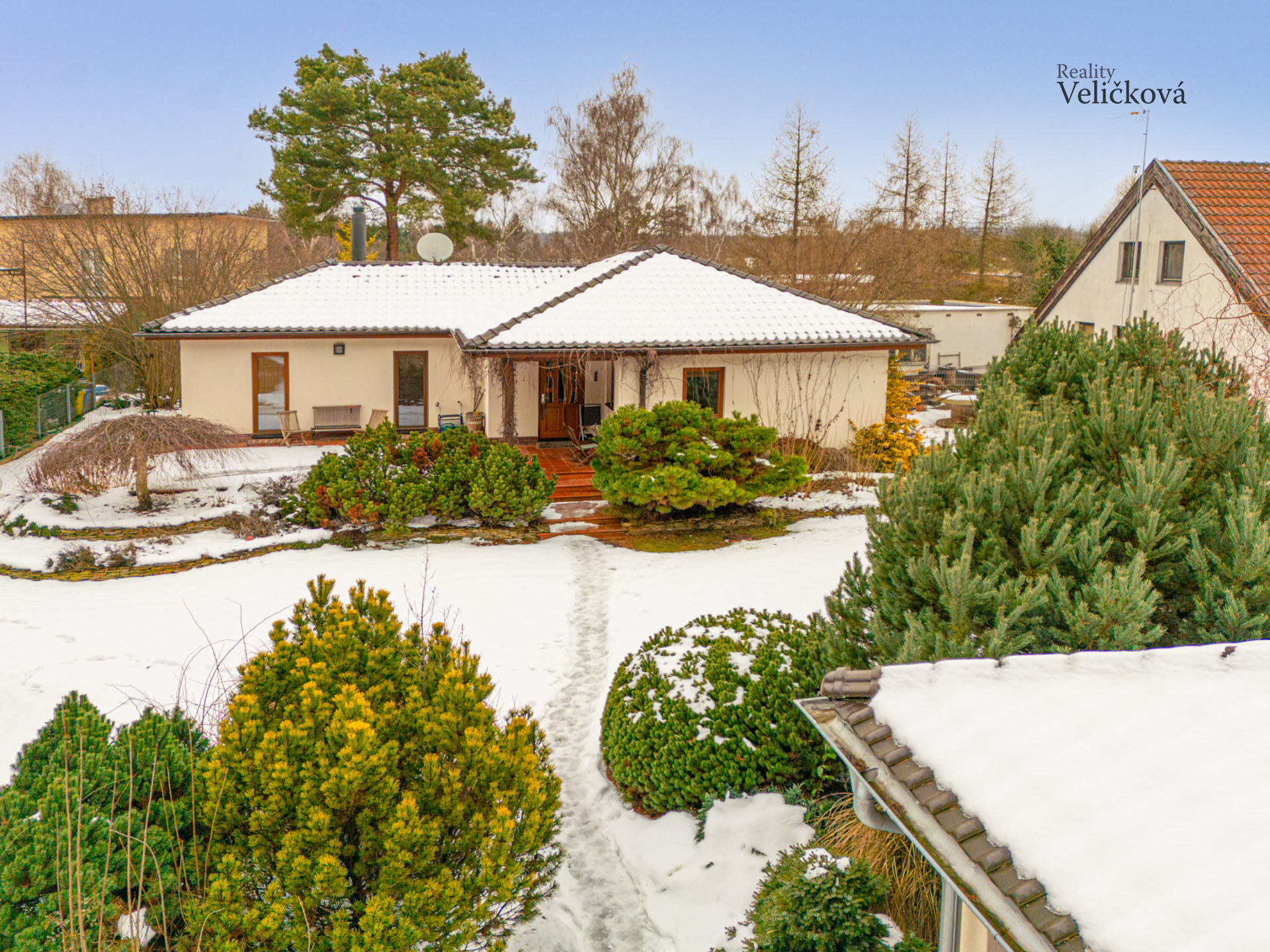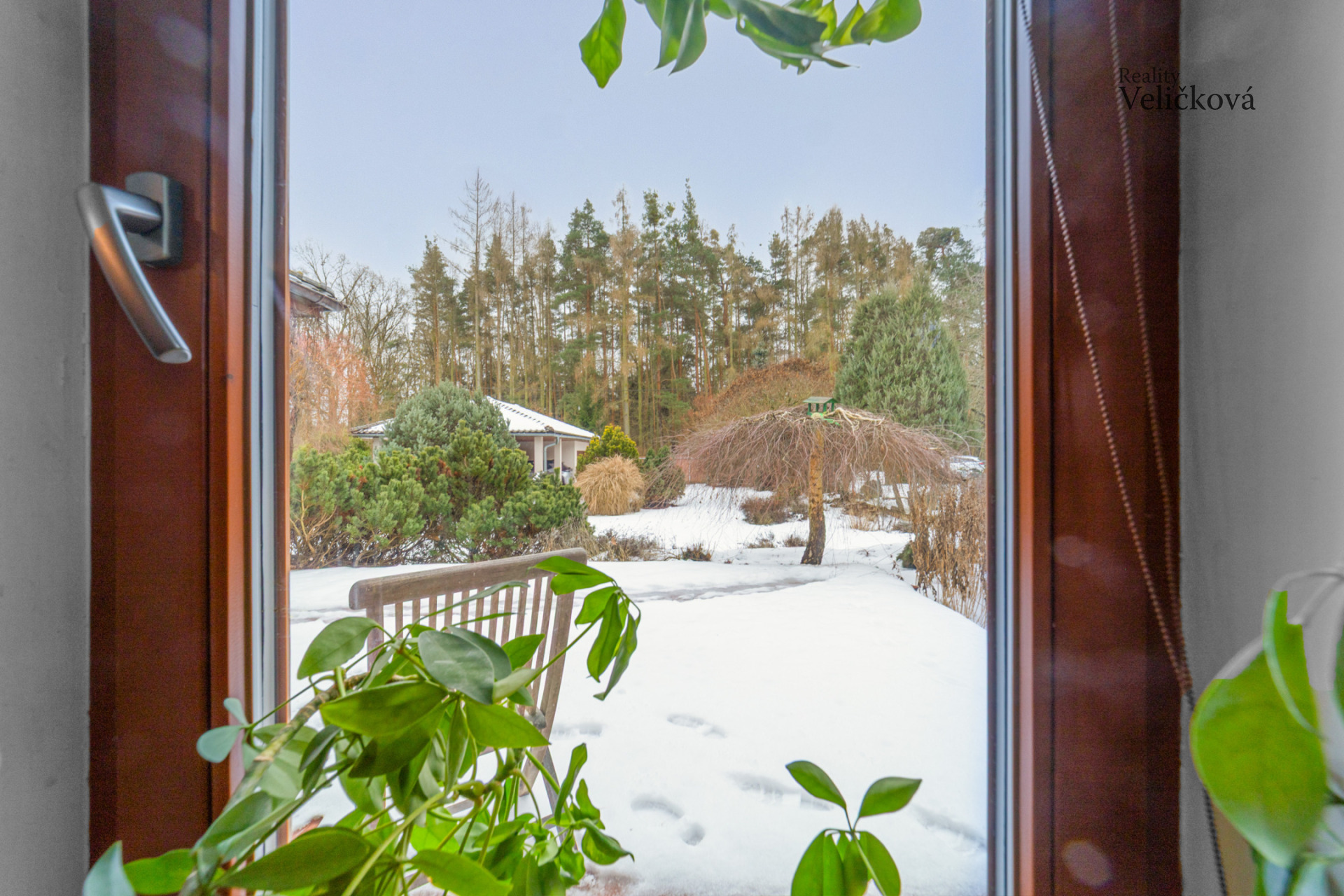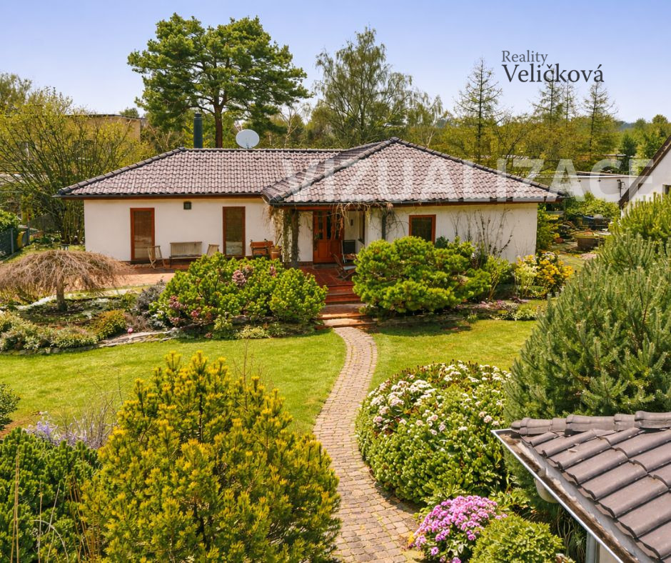 Zahrada je velmi pečlivě udržovaná, osázená stromy, keři a travinami. Za domem se nachází zahradní domek. Krytá terasa je orientována na jižní stranu, směrem k lesu. Pozemek je zcela oplocen, vstup zajišťuje brána s automatickým ovládáním.