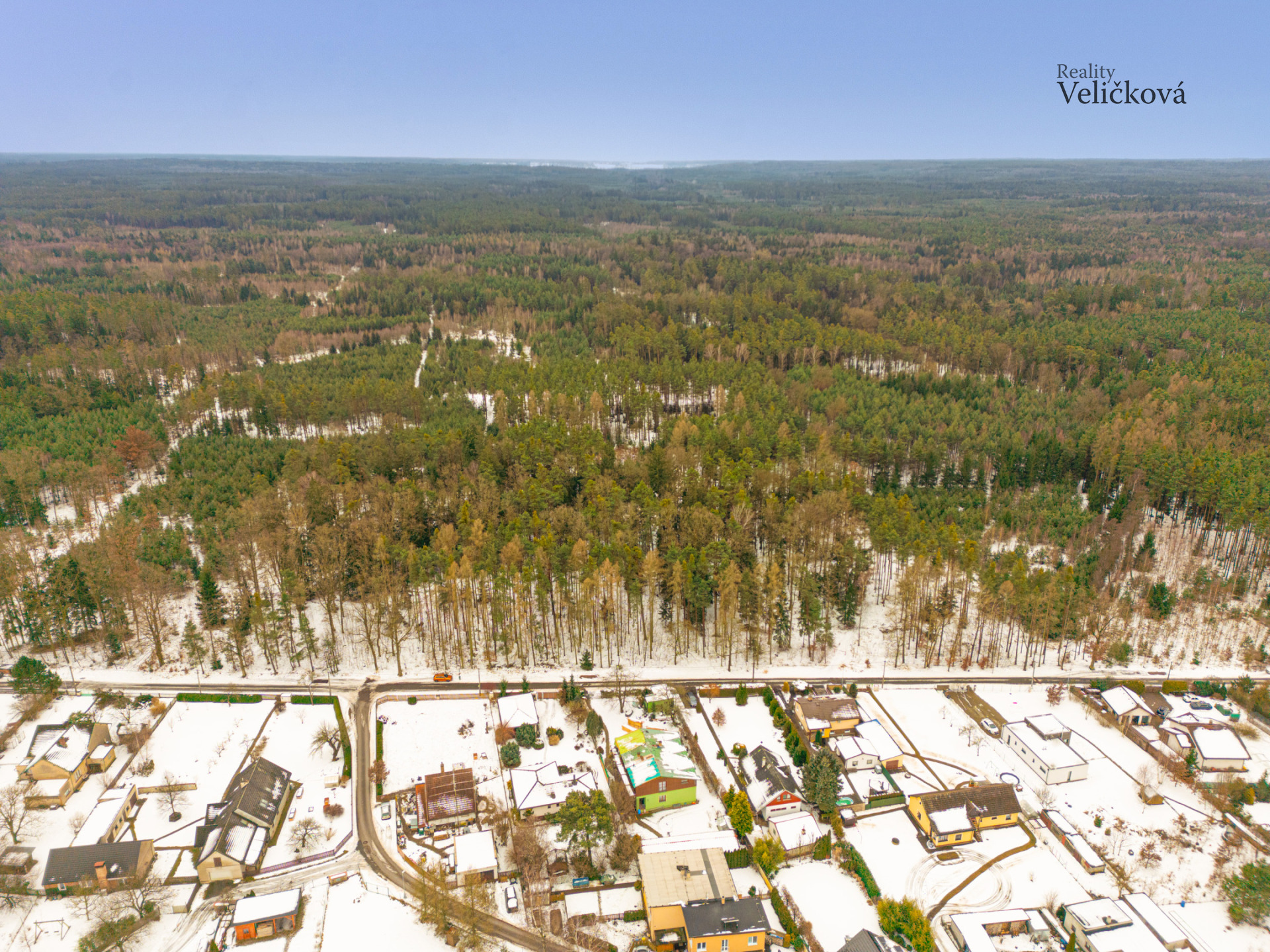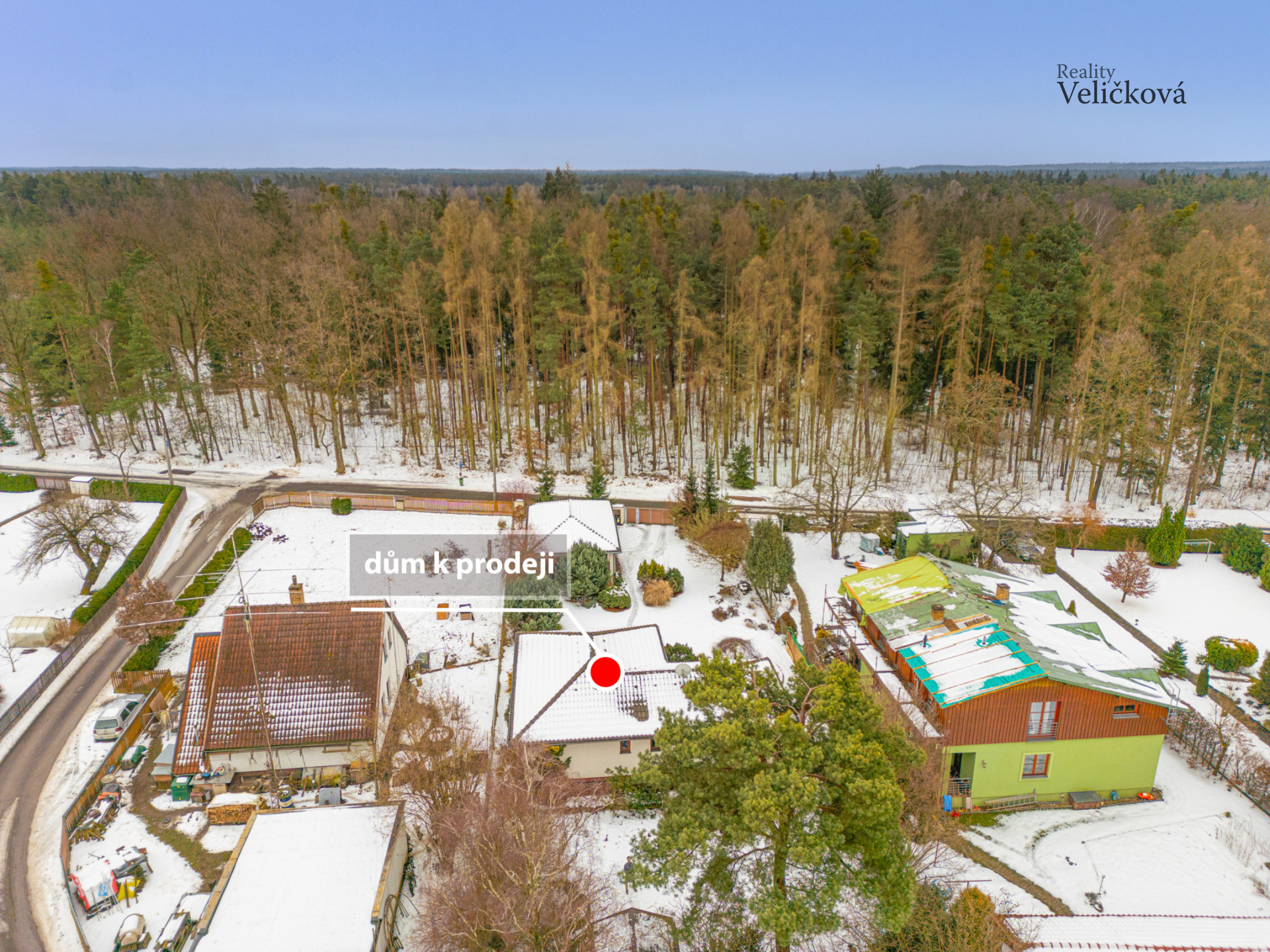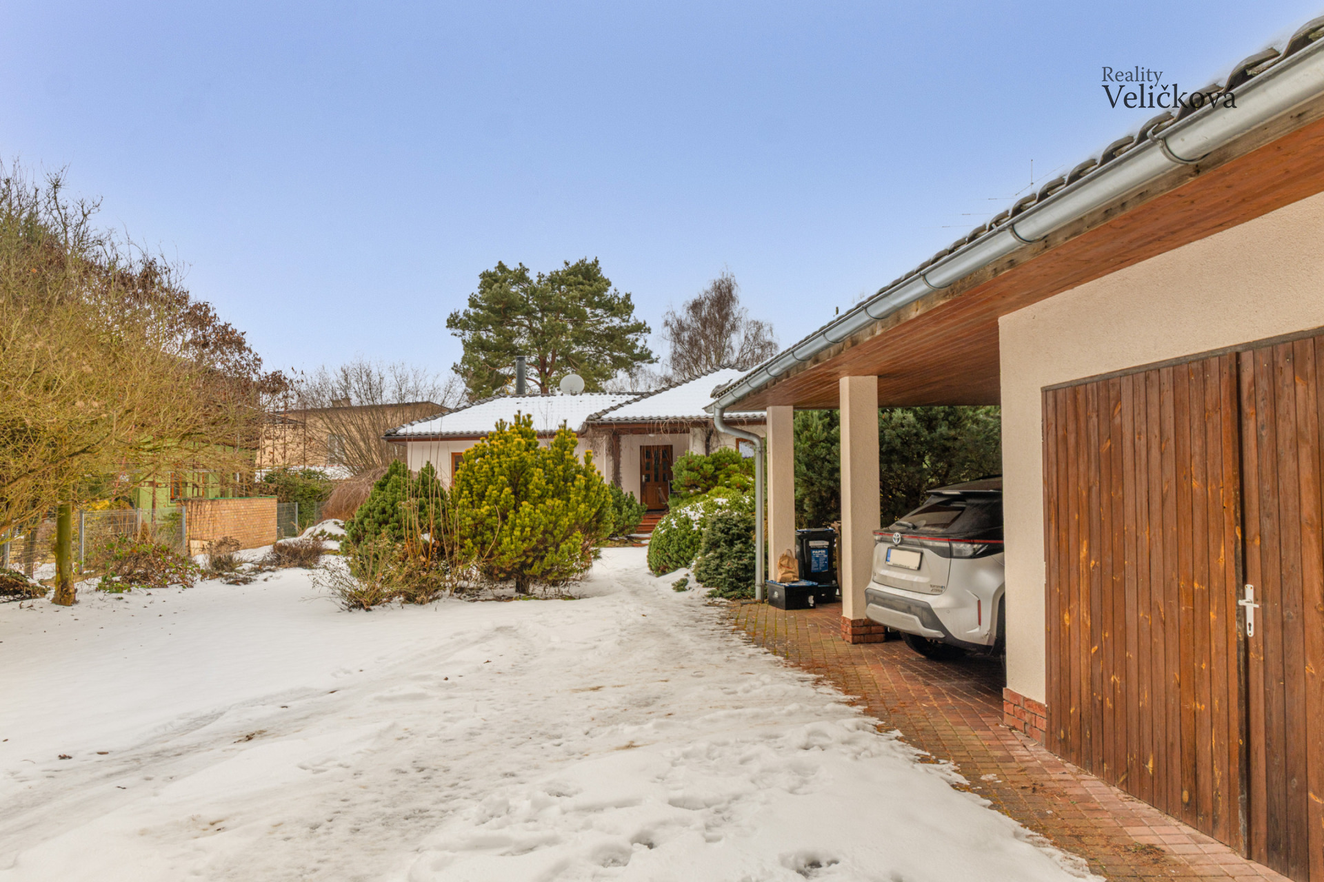 Vjezd na pozemek je z jižní strany od lesa, přičemž ihned po levé straně se nachází garáž a dvě krytá parkovací stání před domem, což zajišťuje dostatek místa pro komfortní parkování.