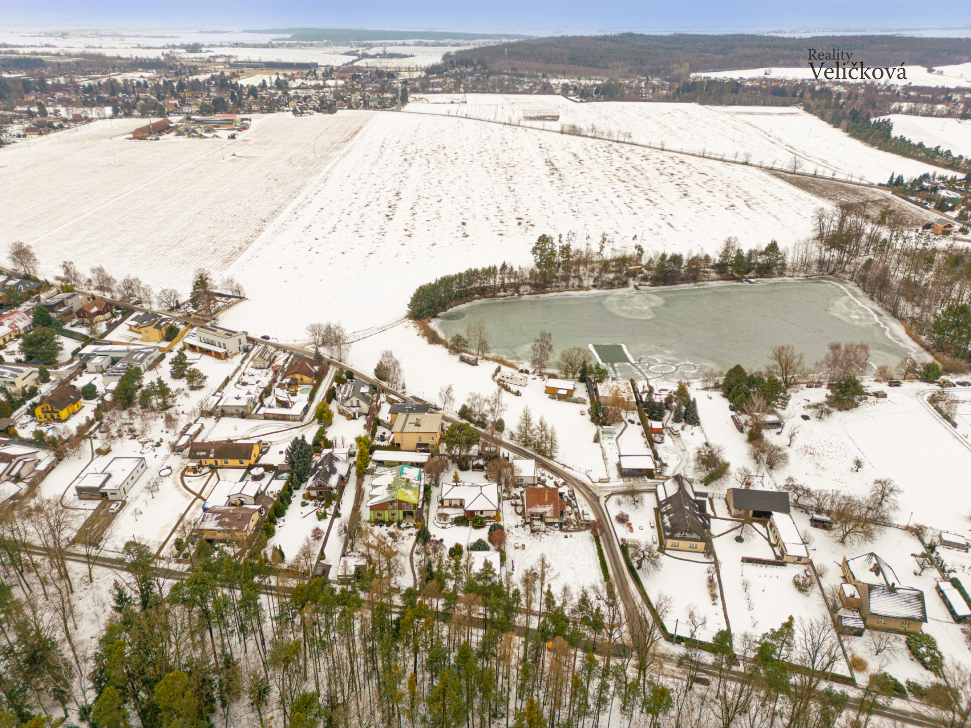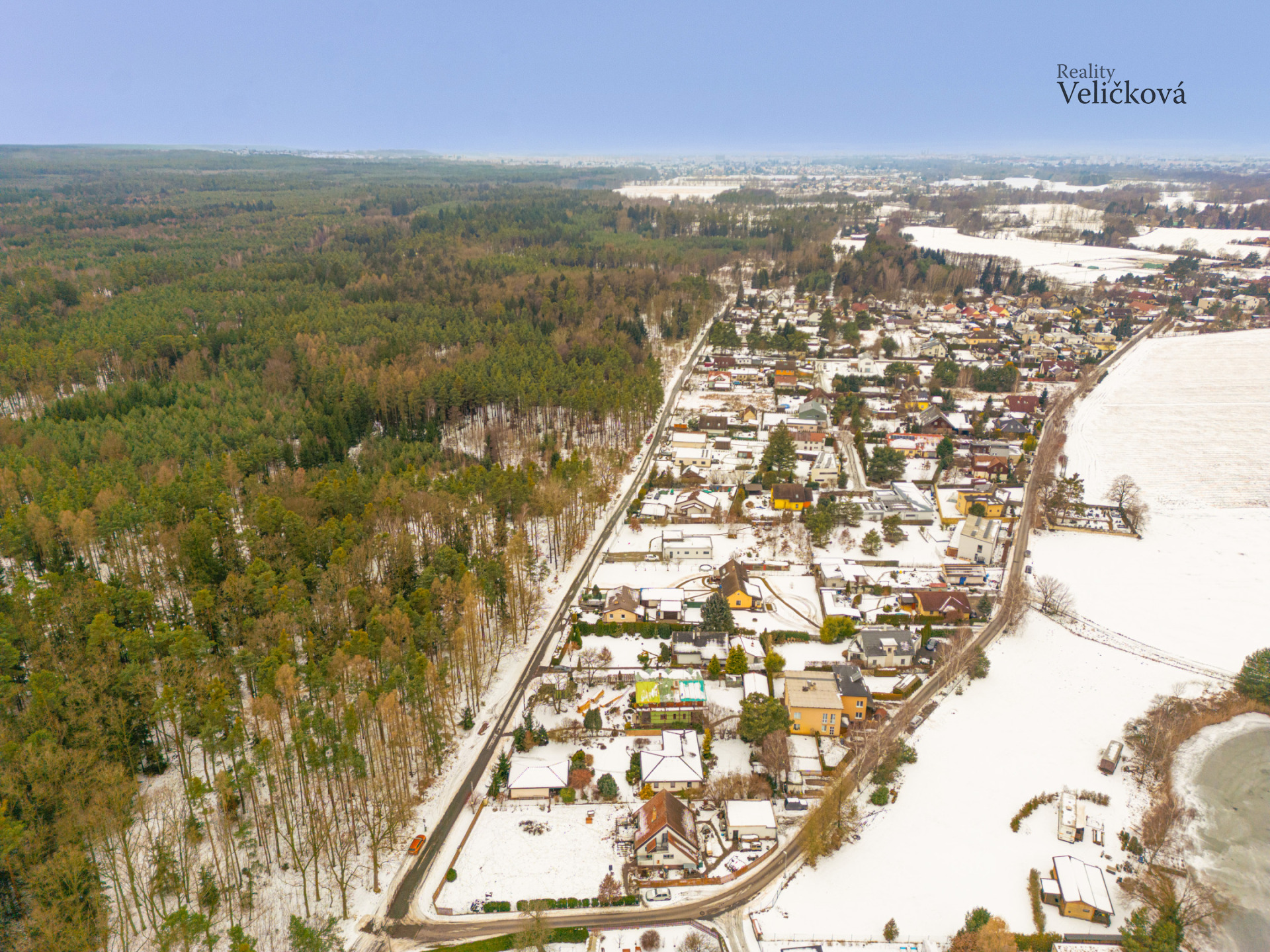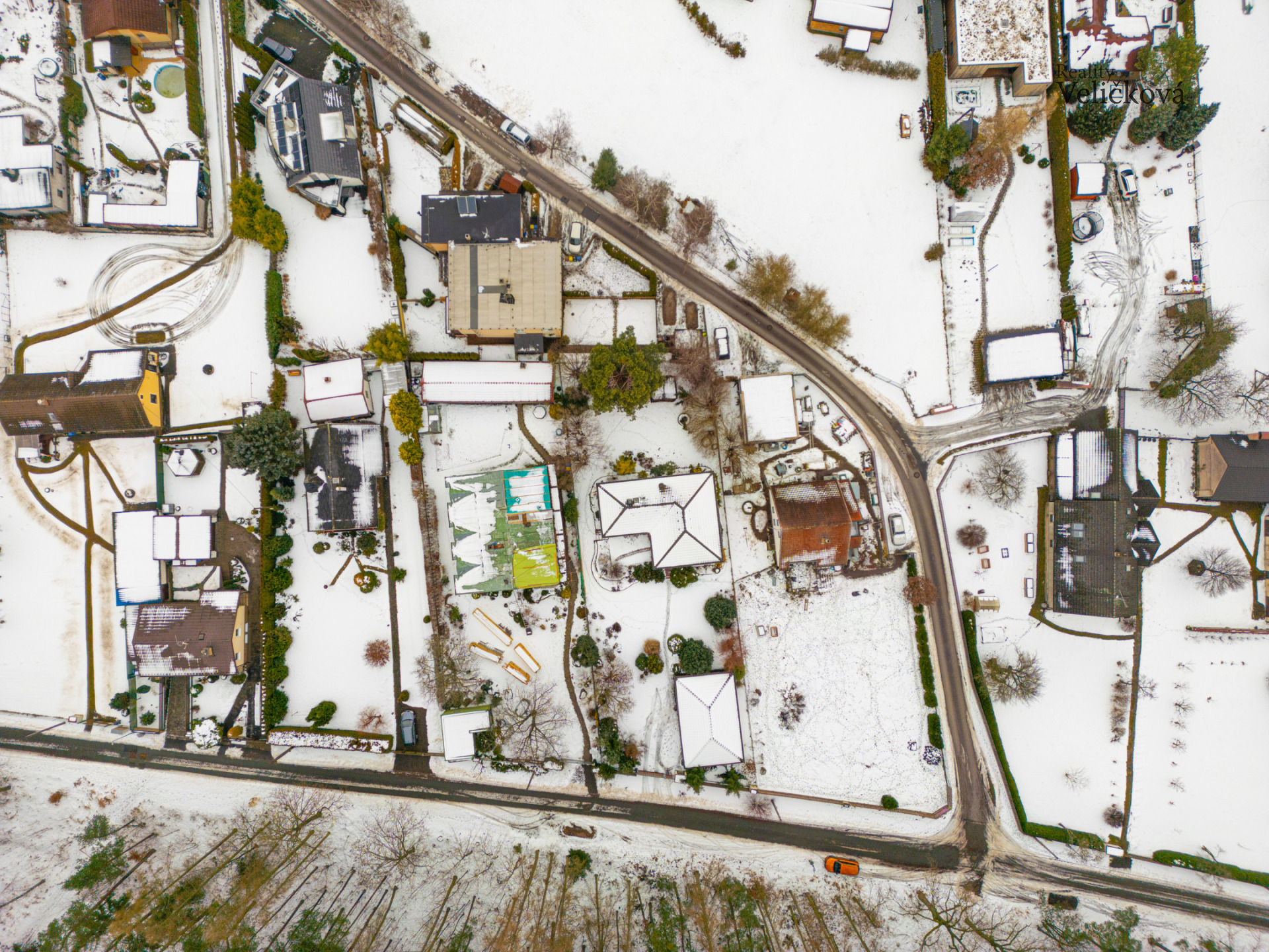 Vjezd na pozemek je z jižní strany od lesa, přičemž ihned po levé straně se nachází garáž a dvě krytá parkovací stání před domem, což zajišťuje dostatek místa pro komfortní parkování.