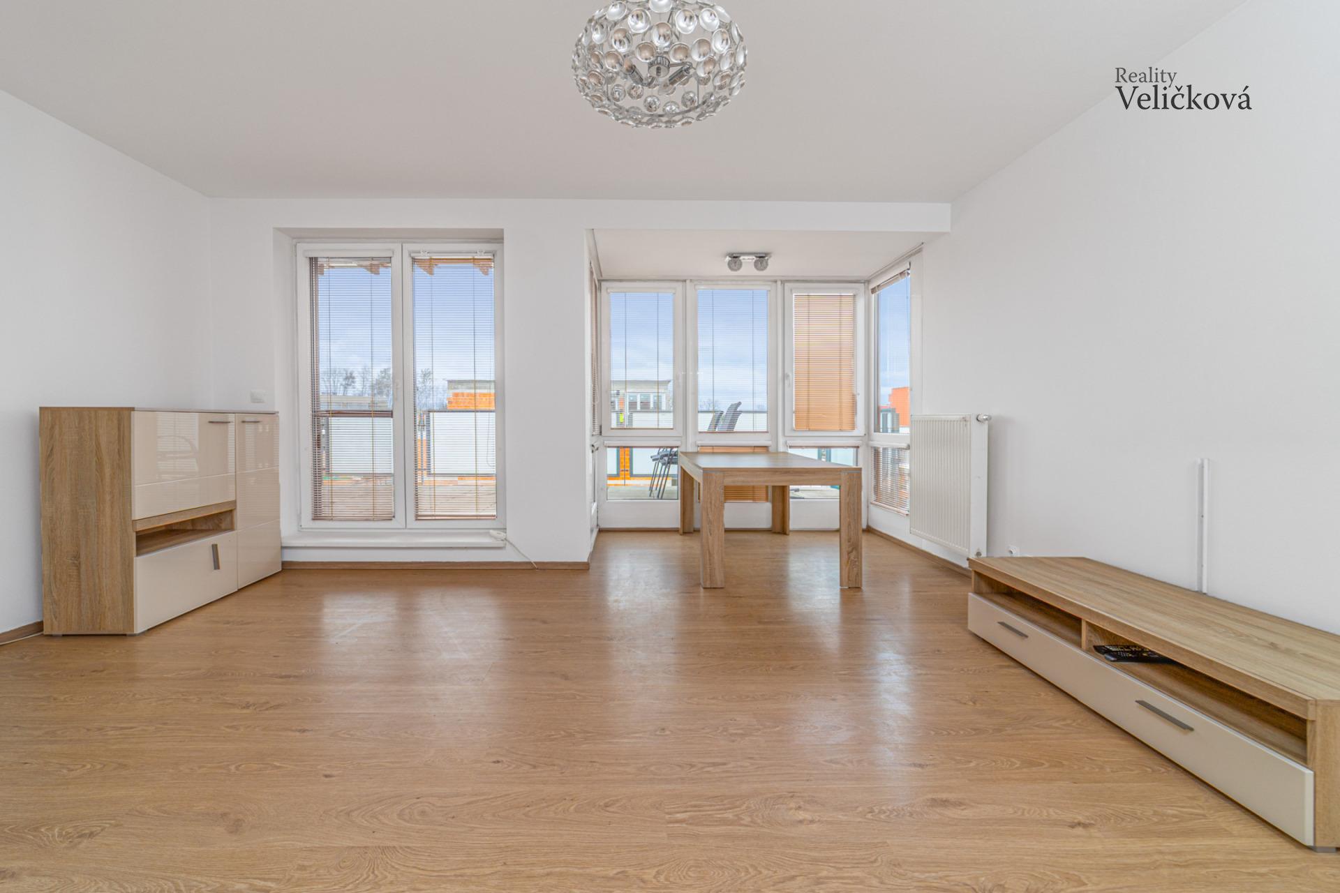 Dispozice bytu: prostorná vstupní chodba, úložná komora/šatna, toaleta se závěsným WC, koupelna s vanou, umyvadlem, prostorem pro pračku a žebříkovým radiátorem, prostorný obývací pokoj s kuchyňským koutem a se vstupem na velkou terasu a dvě ložnice se vstupem na menší terasu orientovanou na západní stranu.